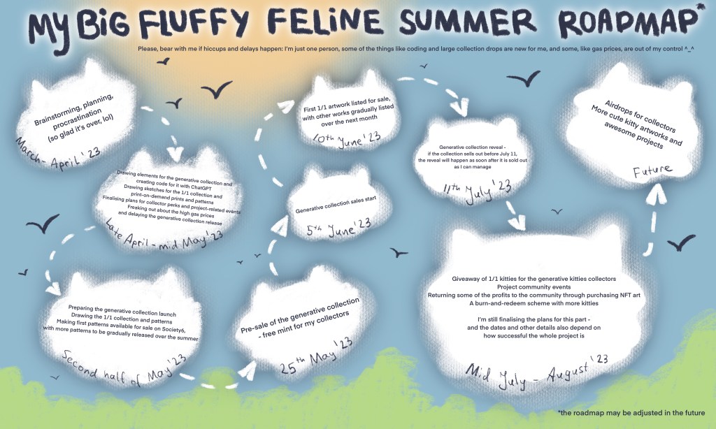“My Big Fluffy Feline Summer” is an ambitious project that combines NFT collections, print-on-demand designs, and digital products. All the main project events and milestones will be featured on this page.